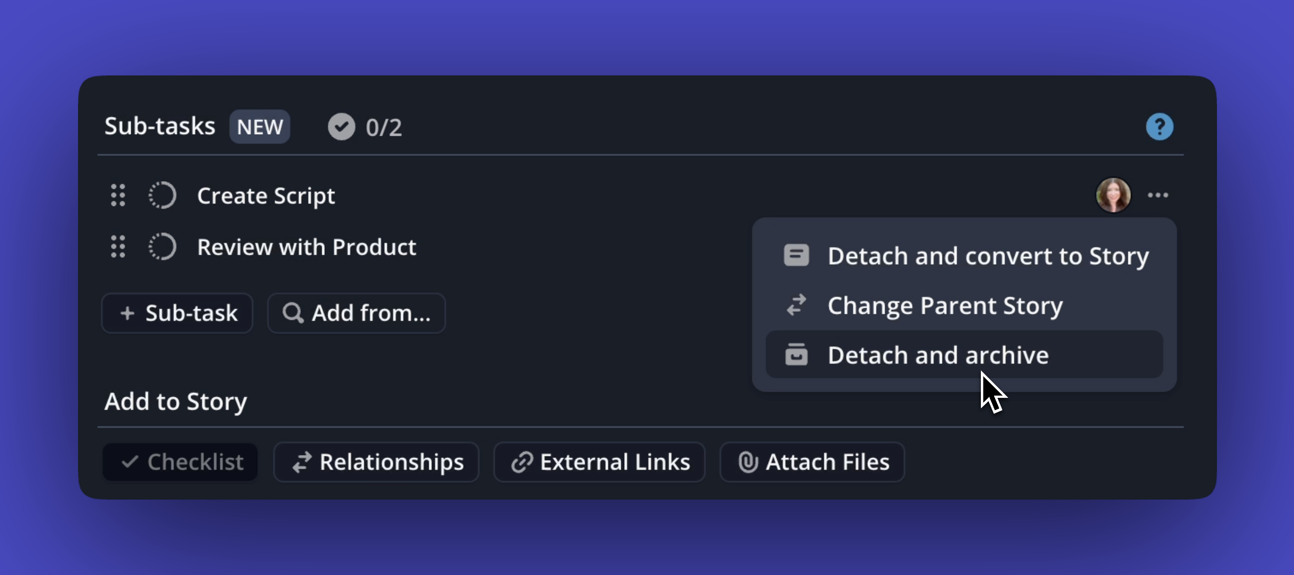 - You can now detach and archive Sub-tasks directly from the Parent Story’s three-dot menu.