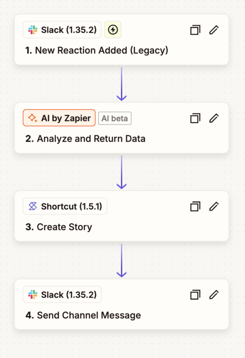 A Zapier automation listens for a specific Slack reaction. When the reaction is added, Zapier formats the message and creates a new Story in Shortcut with the full context.